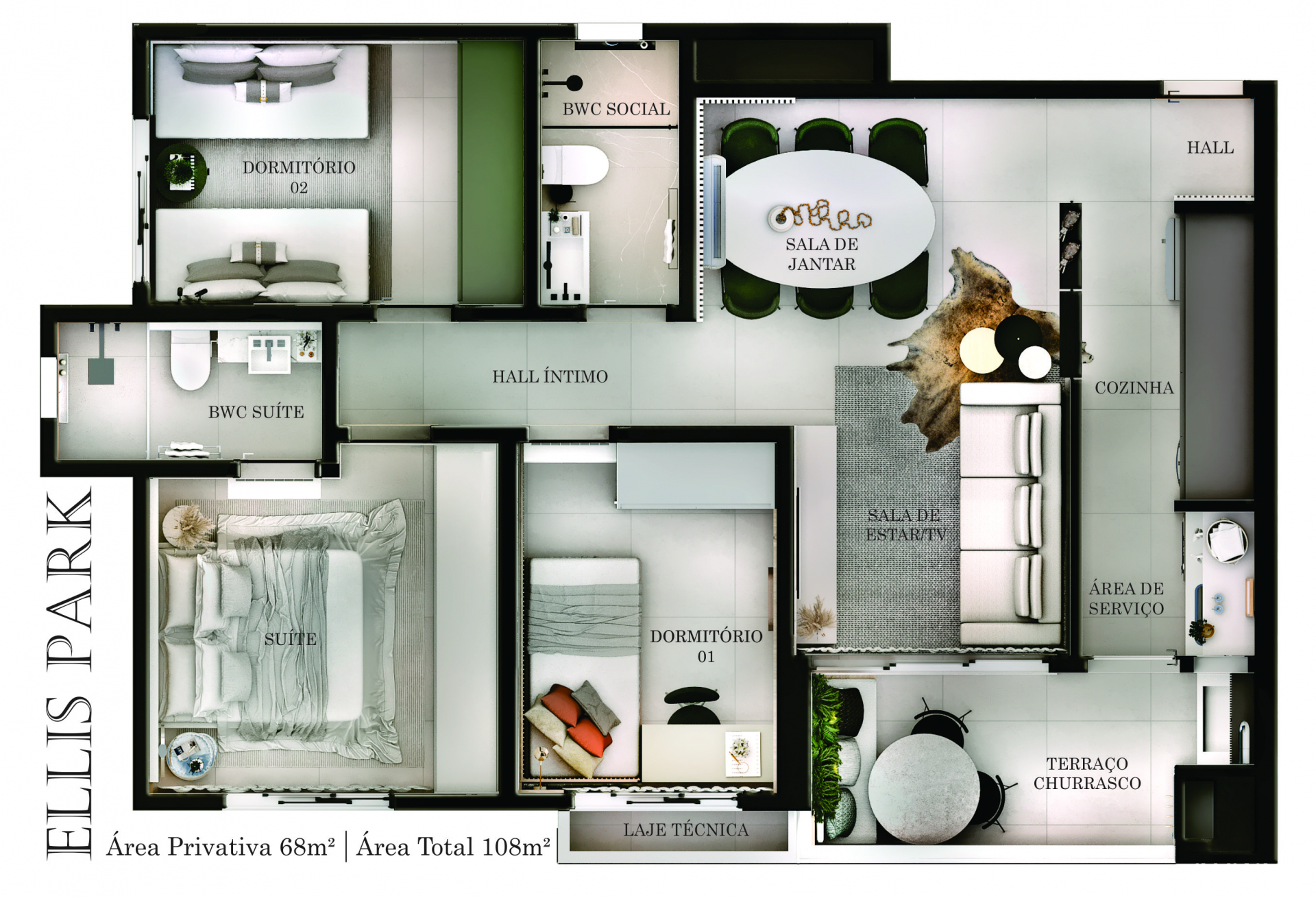- Possui 108 m² de área total e 68 m² de área útil